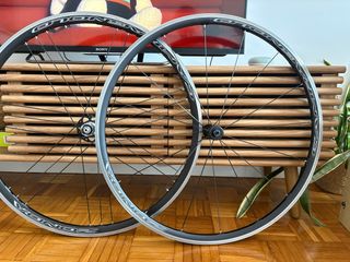 Juego de ruedas Campagnolo Zonda C17 para freno de llanta. Uno de los juegos de ruedas de aluminio más valorados por su ligereza, rigidez y fiabilidad. Ideales para entrenamiento, gran fondo o competición. • Peso. 1550 g • Ancho interno 17 mm (perfectas para cubiertas 25–28 mm) • Radios G3 traseros para mayor rigidez • Compatible Shimano / SRAM 9-11v Estado excelente. Son mi segundo juego de ruedas y se han usado muy poco. • Rodan perfectamente rectas • Pistas de frenado con muy poco desgaste • Bujes suaves Se entregan sin cassette ni neumáticos. Difíciles de encontrar en este estado. Precio nuevo: 400