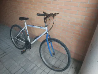 Bicicleta de montaña Alcotán 126, ideal para paseos y rutas. - Cuadro de aluminio. - Ruedas de 26 pulgadas. - Frenos V-Brake. - Cambio Shimano. - Horquilla delantera. - Sillín negro. - Pedales negros. El cambio de marchas va bien. El cambio de plato HABRÍA QUE AJUSTARLO PORQUE EL TERCER PLATO NO ENTRA BIEN, NO DEBE SER COMPLICADO. De ahí el precio bajo, por lo demás está bien.
