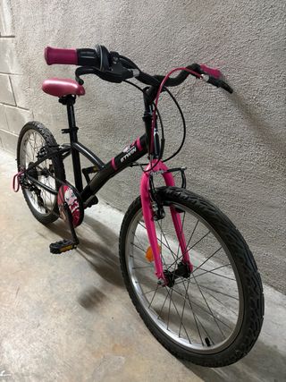 Bicicleta infantil BTWIN en color rosa y negro, ideal para los más pequeños. - Cuadro de acero. - Ruedas de 20 pulgadas. - Frenos V-brake. - Sillín y puños acolchados. - Cambio regulado.