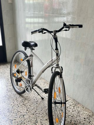 Bicicleta de paseo de la marca Decathlon, ideal para desplazamientos urbanos o rutas tranquilas. Manillar de aluminio. Cambiada la cadena y recamaras de las ruedas. Regalo cesta de compra a estrenar. Manillar de cambios algo estropeados por el calor. En el precio incluye bolsa de herramientas y bote de agua. Solo Valencia y alrededores. - Cuadro de aluminio. - Ruedas de 28 pulgadas. - Frenos V-brake. - Cambio Shimano. - Sillín y manillar ajustables.