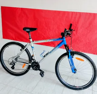 Bicicleta de montaña Decathlon en color azul y blanco. - Cuadro de aluminio. - Ruedas de 26 pulgadas. - Frenos V-brake. - Cambio Shimano de 7 velocidades.Leer bien a recoger en Paiporta