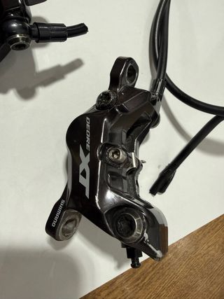 Frenos hidráulicos Shimano Deore XT de 4 pistones. Están en muy buen estado, las pastillas delanteras tienen 5 km de uso, las traseras están a un 70% de uso, preguntar sin compromiso, precio negociable