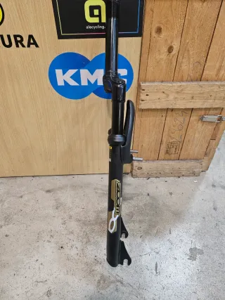 Horquilla de bicicleta 29” Marca Zoom Decorada con pegatinas Rock Shox. Color negro. Tubo de dirección recto Horquilla de muelle Recorrido 100 mm Dirección ahead de 1 1/8 Tubo cortado a 19,5 cm Solo frenos de disco Sistema IS (regalo adaptador) Eje 100 mm Con araña