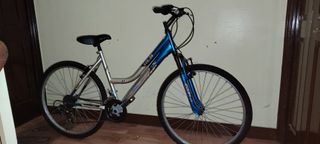 Bicicleta de montaña de color azul con detalles blancos y negros. Ideal para paseos y rutas. - Cuadro de aluminio. - Ruedas de 26 pulgadas. - Frenos de disco. - Suspensión delantera Zoom. - Rueda de atrás más recámara recién cambiada. - La vendo por falta de uso y se me ha quedado chica.