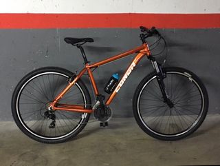 Talla L (para 1,80 de altura) Cuadro de aluminio Transmisión Shimano 3 platos y 7 piñones Horquilla: Zoom 389, recorrido 80mm. Frenos: V-Brake aluminio. Desviador: Shimano TY300. Cambio trasero: Shimano TY-21. Cubiertas: 29″X2,10 V85 OCELOT. Regalo pedales automáticos Como nueva HAY QUE RECOGERLA EN UN PUEBLO A 70 KM DE MADRID