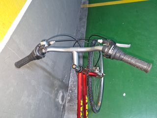 Bicicleta de montaña en color rojo.3 platos y 7 piñones. Rueda 700 - Manillar con puños y frenos. - Rueda delantera visible.