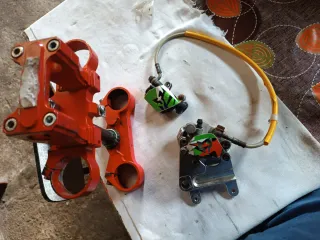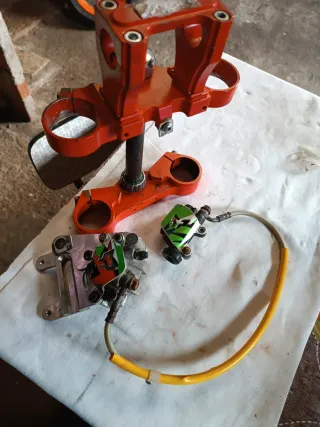 Conjunto de tija y freno para motocicleta. - Tija de color naranja. - Freno con detalles verdes y naranjas.