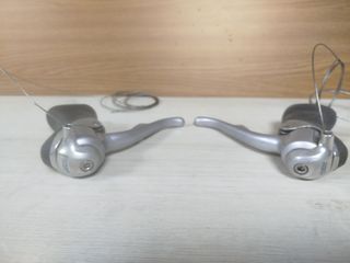Manetas de freno y cambio para bicicleta. - Diseño ergonómico. - Material metálico plateado. - Incluye cables.