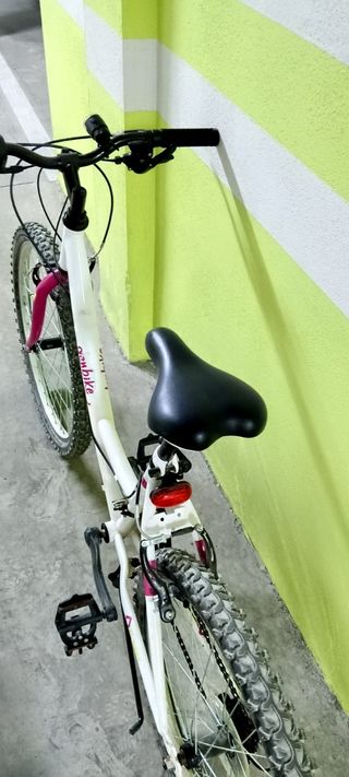 Estupenda Bicicleta infantil de 24 pulgadas, ideal para niñas. - Cuadro blanco. - Ruedas con tacos para montaña. - Sillín negro. - Pedales negros. -Manetas de freno nuevas de aluminio. -Cambio 21 v., el cambio de piñón es un Shimano de palanca, para facilitar el cambio. -Muy poco uso lo puedes comprobar en las ruedas y el sillín. -Ideal para niña , el cambio de tamaño y edad.