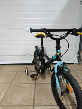 Bicicleta infantil de color azul y negro, ideal para los más pequeños. - Ruedines incluidos para mayor estabilidad. - Manillar negro con puños amarillos. - Frenos de mano. - Cubrecadenas para mayor seguridad.