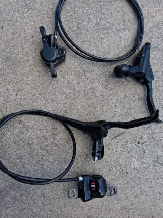 Set de frenos de disco para bicicleta, sistema de aceite. - Incluye manetas, latiguillos y pinzas. - Color negro.