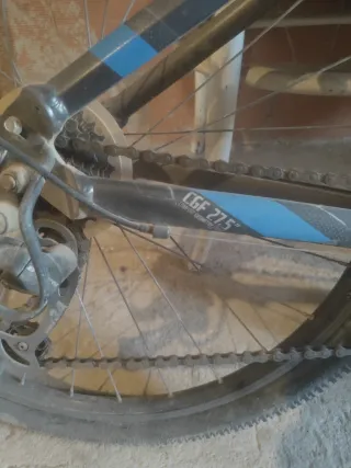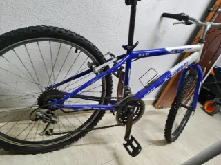 Bicicleta de montaña con cuadro blanco y detalles azules. - Suspensión delantera. - Frenos de disco. - Incluye casco y portabidón. Tal cual. Sólo hinchar ruedas. Regalo casco y candado