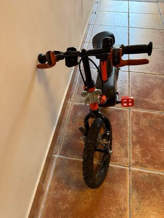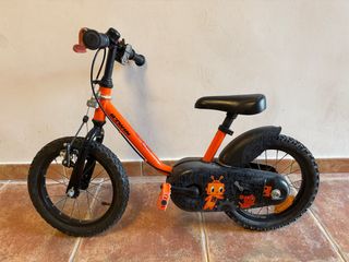 Bicicleta infantil B'TWIN de color naranja, ideal para los más pequeños. - Ruedas de 12 pulgadas. - Diseño con pegatinas de robots. - Frenos delanteros y traseros.