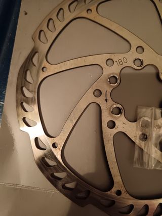 Dos discos de freno para bicicleta de montaña, de 180mm. Se encuentran en buen estado, con algunas marcas de uso. - Diámetro: 180mm - Para bicicleta de montaña (MTB) - Tornillos color titanio incluidos