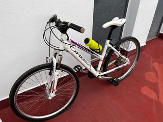 Bicicleta Orbea Sport modelo MTB Cross Country Paradise Zoom 386. - Cuadro de aluminio ligero. - Suspensión delantera. - Frenos de disco. - Ruedas de 26 pulgadas. - 7 velocidades. - 3 marchas. - Color blanco con detalles morados. *Incluye: casco, candado, faro y botella. MEDIDAS - 1 m de altura de manillar. - 176 cm de largo.