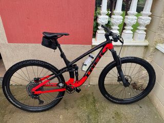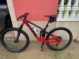 Bicicleta de montaña Trek con un diseño llamativo en rojo y negro. Horquilla rockshox de 140mm y amortiguador trasero con 3 posiciones. Transmisión sram nx eagle y frenos shimano mt4100. Ruedas tubelizadas y cubierta trasera recien cambiada a pirelli. Tambien tiene tija telescópica y cadena nueva recien puesta