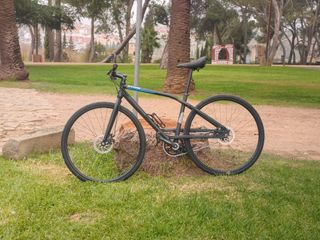 Bicicleta urbana-híbrida de Decathlon. En muy buen estado. Todo funciona correctamente y no tendrás que llevarla al taller tras comprarla. Bicicleta sencilla y sólida. Ideal para paseos y desplazamientos por ciudad, carril bici y pistas de grava y tierra en buen estado. Con postura cómoda, con la espalda no muy inclinada. - Talla M (166 - 178 cm de altura). - Transmisión monoplato y cambio de 6 marchas Sunrace. - Cassette Shimano. - Frenos V-brake. - Manillar regulable en altura. Se puede ver en persona en Badajoz capital. Entrega en mano.