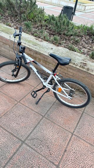 Bicicleta junior de la marca Rockrider, modelo ST 100. muy poco uso - Cuadro de color blanco con detalles gráficos. - Ruedas nuevas . - Sillín negro. - Frenos manuales.
