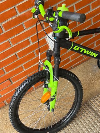 Bicicleta de montaña infantil B'TWIN Racingboy 500, ideal para iniciarse en el ciclismo. - Cuadro de acero resistente. - Ruedas de 20 pulgadas. - Frenos V-brake. - Sillín ajustable en altura. - Diseño deportivo en negro y verde.