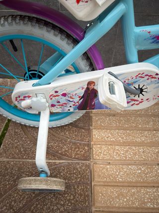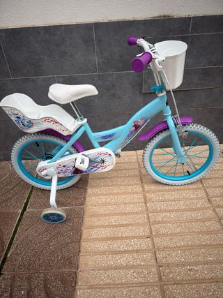 Bicicleta infantil Huffy de 16 pulgadas Diseño con licencia oficial de Disney Frozen, incluyendo gráficos de los personajes Elsa y Anna. Incluye ruedas de entrenamiento estabilizadoras extraíbles para ayudar en el aprendizaje. Cuenta con una cesta delantera blanca y un portamuñecas trasero. Equipada con frenos delanteros y traseros para mayor seguridad. Tiene un año NO ENVIO.