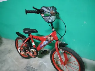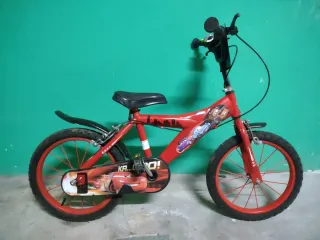 Bicicleta infantil de color rojo con diseño de Cars. Ideal para los más pequeños.Cadena protegida. Necesita cambio de frenos y tiene algunos signos de uso pero aún con vida útil.