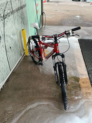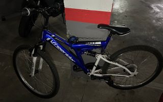 Bicicleta de montaña con doble suspensión, ideal para terrenos irregulares. Usada 1 única vez, almacenada desde entonces. - Cuadro de color negro con detalles rojos. - Horquilla delantera roja. - Ruedas de 26 pulgadas. - Frenos de zapata. + Cuadro de bicicleta de montaña talla M con rueda trasera.