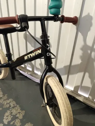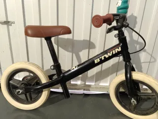 Bicicleta de equilibrio Btwin Runride 520, ideal para iniciarse en el mundo de las dos ruedas. Con estilo!! En perfecto estado!!👌 Freno trasero 🦺 Maneta freno con regulación para los más pequeños 👶 Color negro. 🎱 Puños marrones.👊 Ruedas blancas.🛞 Envíos a toda España 🇪🇸