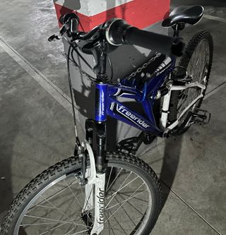 Bicicleta de montaña Freerider en color azul y blanco. Funciona correctamente unico detalle el freno de adelante no frena casi, por lo demas todo correcto, Para reparar o usarse tal y como esta. Se han cambiado puños y pedales. - Cuadro de aluminio. - Suspensión delantera y trasera. - Ruedas de 26 pulgadas.