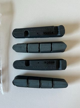Pastillas de freno Shimano R55C4 diseñadas para llantas de carbono. - Compuesto R55C4. - Compatibles con sistemas de freno Shimano. - Material: Goma. Nuevas sin estrenar. Incluye 4 piezas (2 pares)