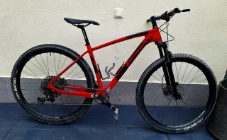 Bicicleta de montaña Trek Procaliber 9.5 en color rojo. Se encuentra en perfecto estado. Tiene una pequeña falta de pintura a un lado de haberle saltado algún chinato que realmente es imperceptible. No se le ha llegado ni a hacer 100 kms. Prácticamente es a estreno. Fue un capricho y se vende por falta de uso. - Cuadro de carbono. - Ruedas de 29 pulgadas. - Transmisión Shimano. - Frenos de disco hidráulicos. - Talla M