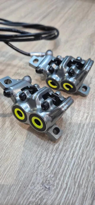 Latiguillos 84 y 146 centímetros - Pastillas galfer con 3 salidas - 4 pistones - Detalle en color amarillo flúor. - Shimano - Shigura