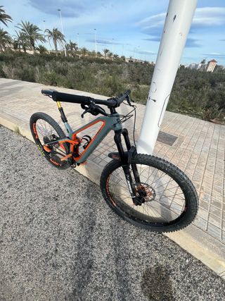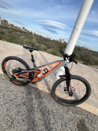 Bicicleta de montaña conwey con doble suspensión, ideal para terrenos para hacer enduro. Su diseño combina colores gris y naranja. Talla M - Cuadro de carbono - Horquilla delantera RockShox 150 mm y horquilla de en medio fox 140mm -frenos de disco hidráulicos 4 pistones - Ruedas de 29 pulgadas Mas informacion preguntar (precio negociable )