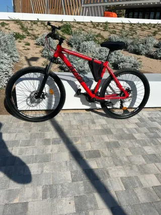 Bicicleta eléctrica en color rojo, con un diseño moderno y deportivo. Se encuentra en excelente estado, casi como nueva. - Rueda de 27 pulgadas. - Batería integrada en el cuadro. - Suspensión delantera. - Frenos de disco.