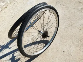 Pack de dos ruedas completas de bicicleta 26 pulgadas y frenos de zapata. Usadas en ciudad, giran bien y están centradas. La pista de frenado sin desgaste. - Aros Araya 26" de aluminio - Bujes Shimano Parrallax - Ejes qr9 estándar Originales Shimano. - Casette Shimano - Neumáticos 26x1.50 al 90% Posibilidad de cambiar los neumáticos que lleva por unos de montaña.