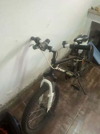 Bicicleta infantil de la marca B'Twin, ideal para los más pequeños. Su diseño combina el color negro del cuadro con detalles en verde. - Ruedas de 16 pulgadas. - Frenos delanteros y traseros cambiados, con manetas nuevas - Sillín ajustable. - Guardabarros delantero y trasero.