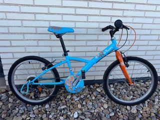 Bicicleta infantil Btwin Design, ideal para los más pequeños. Su diseño es moderno y llamativo. - Cuadro de acero. - Ruedas de 20 pulgadas. (creo) - Frenos V-brake. - Sillín ajustable. ruedas pinchadas. necesita cambiar las dos cámaras de aire no incluye la luz. altura manillar 76cm altura mínima sillín 60cm