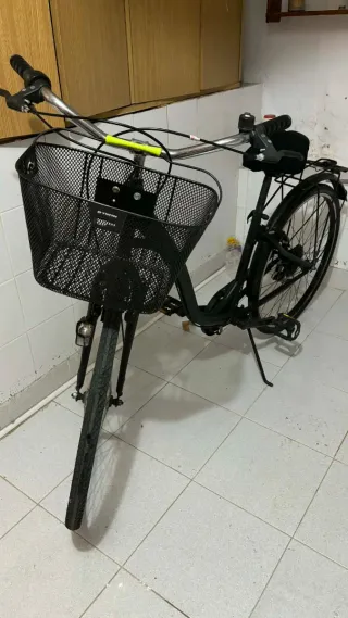Bicicleta de paseo en color negro, ideal para desplazamientos urbanos. Cuenta con una práctica cesta delantera. - Cesta de malla negra. - Manillar curvo plateado. - Guardabarros delantero y trasero. - Pata de cabra. Sistema de freno completo resien cambiado, las marchas no van, se pueden reparar , esta en la marcha 4.
