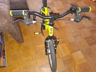 Bicicleta infantil de color amarillo brillante, ideal para los más pequeños. Se encuentra en muy buen estado, con muy poco uso. - Ruedas de 16 pulgadas. - Incluye ruedines para facilitar el aprendizaje. - Frenos manuales.