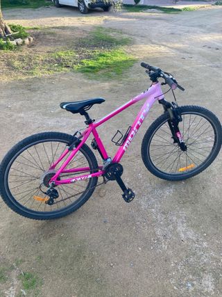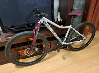 Bicicleta de montaña Rockrider 100 en color blanco y rosa. Ha sido usada muy pocas veces. - Cuadro de aluminio. - Ruedas de 27.5 pulgadas. - Frenos de disco. - Suspensión delantera.