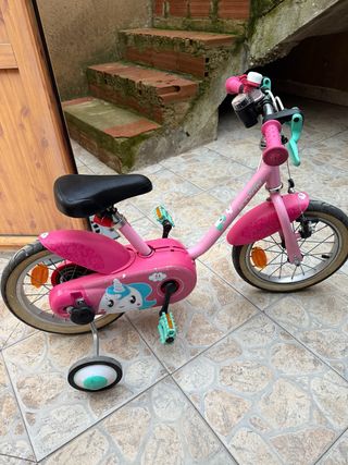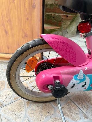 Bicicleta infantil de color rosa, perfecta para los primeros paseos. - Diseño con dibujo de unicornio. - Incluye ruedines de aprendizaje. - Frenos de mano.