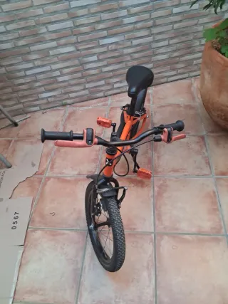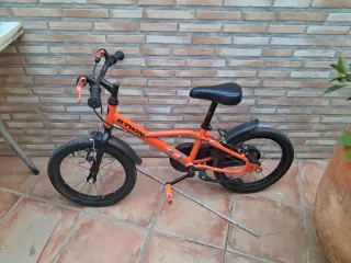 Bicicleta infantil de color naranja, marca Btwin. - Ruedas de 16 pulgadas. - Frenos delanteros y traseros. - Sillín ajustable. - Guardabarros delantero y trasero.