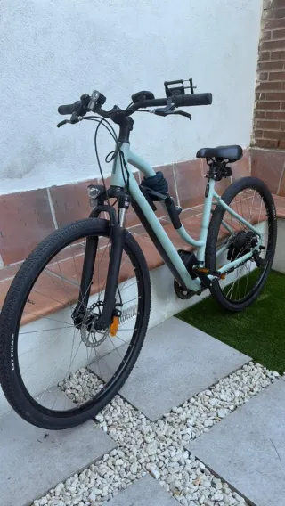 Bicicleta eléctrica Rockrider A-ctv100 en color blanco y negro. Diseñada para ofrecer una experiencia de pedaleo asistido. - Cuadro de aluminio. - Ruedas de 28 pulgadas. - Frenos de disco. - Motor central. - Batería integrada. La bicicleta la entrego sin cargador y sin llaves que vale 40 euros en Decathlon por eso el precio