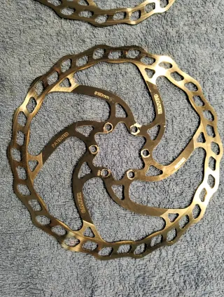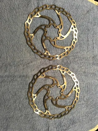 Dos discos de freno para bicicleta, listos para instalar. - 20€ la pareja. - Diámetro de 180mm. - Diseño optimizado para disipación de calor. - Fabricados en acero inoxidable. - 6 Tornillos.