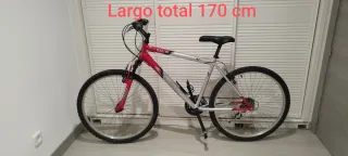 Muy buen estado, casi perfecto, salvo un pequeño roce en un lateral (ver última foto). Apenas usada. El estado de las ruedas sin desgaste, aún conserva los pelitos del caucho. Los pedales son para calzado con calas. No encuentro los pedales originales pero es algo que se puede comprar y colocar sin difcultad. Longitud total de 170 cm. Frenos de disco. Cambio de marchas Shimano. Tubo de asiento 44 cm que equivale a una talla de 17 pulgadas (para saber que talle necesita recomiendo consultar en youtube como calcularlo) Es de la marca Cup's (Alcampo) La rueda delantera se puede desmontar. Recogida en Loranca.