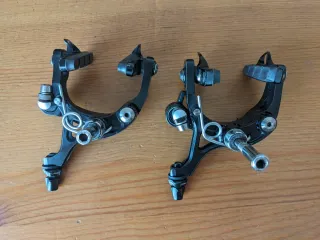 No negociable!!!! Frenos Campagnolo croce d'une, DeltaPieza icónica para bicicletas clásicas. Portazapatas Campagnolo con tornillos originales, un juego de zapatos en buen estado el otro a medio uso freno trasero con el logo borrado freno delantero con el logo a mitad de vida. Tienen marcas estéticas. Uno de los piezas superiores (última foto) tiene restos de tope de funda de freno Funcionamiento bueno. - Diseño Delta. - Material de aluminio.