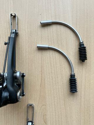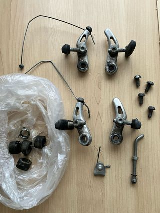 Conjunto de repuestos para frenos cantilever de bicicleta. Incluye varias piezas metálicas y tornillos - Dos brazos de freno cantilever. - Cables de freno. - Tornillos de montaje. - Resortes y otros componentes pequeños. ( recomiendo limpieza y revisar ) *** para aprovechar los repuestos **