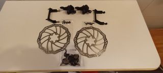 Conjunto de frenos de disco mecánicos para bicicleta de carretera. Incluye pinzas, discos y tornillería.5 pares de pastillas sin usar no llega a 500 km El precio es de 30 euros cada kit Venta en persona en zona de Fuenlabrada - Dos pinzas de freno mecánicas. - Dos discos de freno. - Tornillería para montaje.