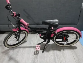 Bicicleta infantil en buen estado, ideal para los más pequeños. - Color principal negro con detalles en rosa. - Ruedas con banda blanca. - Pedales rosas. Frenos nuevos