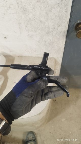 Frenos de disco para bicicleta de la marca Shimano. El conjunto incluye maneta y latiguillo. - Maneta de freno de color negro. - Latiguillo de freno negro.