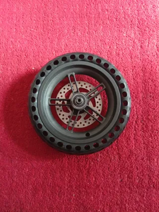 Rueda de patinete con disco de freno incorporado. -neumatico mazizo - Llanta negra. - Disco de freno plateado con múltiples orificios.